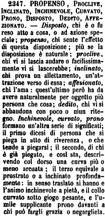 | Propenso, Proclive, Inclinato, Inchinevole, Curvato, Prono, Disposto, Dedito, Affezionato - Disposto, chi è o fu reso atto a cosa, o ad azione speciale; propenso, chi sente l'effetto di questa disposizione; più se la disposizione è naturale; proclive, chi vi si lascia andare o facilissimamente vi si lascerebbe; inclinato, chi prova un allettamento, un'attrazione verso di essa; affezionato, chi l'ama: quest'ultimo però ha da avere naturalmente per oggetto più persona che cosa; dedito, chi vi si abbandona con poco o niun ritegno. Inchinevole, curvato, prono formano un'altra serie di significati; il primo dicesi di persona che si piega in atto di riverenza, o che tende a piegarsi; il secondo, di chi è già piegato, e così sta, descrivendo col dorso una curva più o meno arcuata; il terzo equivale a prostrato o a inchinato profondamente: in senso traslato si hanno e l'animo inchinevole a pietà, e il collo curvato sotto giogo pesante, e l'umile supplicante prono davanti a chi può fargli grazia o negargliela. [immagine] |