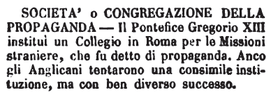 | Società o congregazione della propaganda - Il Pontefice Gregorio XIII instituì un Collegio in Roma per le Missioni straniere, che fu detto di propaganda. Anco gli Anglicani tentarono una consimile instituzione, ma con ben diverso successo. [immagine] |