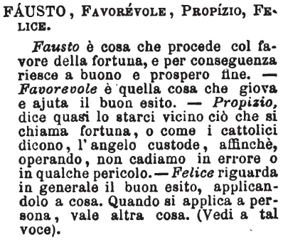 | Fausto, Favorevole, Propizio, Felice - Fausto è cosa che procede col favore della fortuna, e per conseguenza riesce a buono e prospero fine, - Favorevole è quella cosa che giova e ajuta il buon esito. - Propizio, dice quasi lo starci vicino ciò che si chiama fortuna, o come i cattolici dicono, l'angelo custode, affinchè, operando, non cadiamo in errore o in qualche pericolo. - Felice riguarda in generale il buon esito, applicandolo a cosa. Quando si applica a persona, vale altra cosa. (Vedi a tal voce). [immagine] |