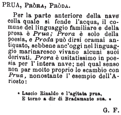 Prua, Prora, Proda - Per la parte anteriore della nave colla quale si fende l'acqua, il comune del linguaggio familiare e della prosa è Prua; Prora è solo della poesia, e Proda può dirsi oramai antiquato, sebbene anc'oggi nel linguaggio marinaresco vivano alcuni suoi derivati. Prora è usitatissimo in poesia per l'intera nave; nel qual senso non par molto proprio lo scambio con Prua, nonostante l'esempio dell'Ariosto: