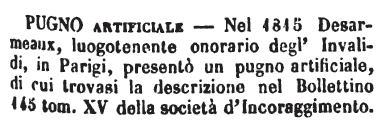 | Pugno artificiale - Nel 1815 Desarmeaux, luogotente onorario degl'Invalidi, in Parigi, presentò un pugno artificiale, di cui trovasi la descrizione nel Bollettino 145 tom. XV della società d'Incoraggimento. [immagine] |