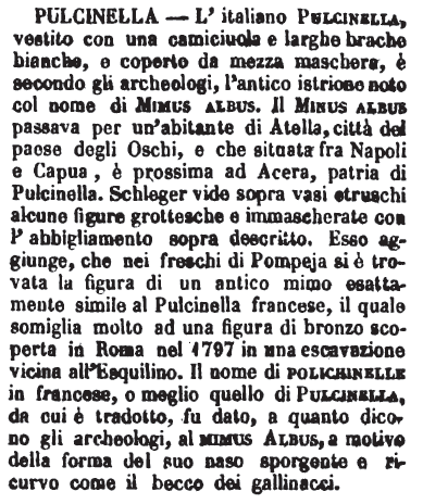 | Pulcinella - L'italiano Pulcinella, vestito con una camiciuola e larghe brache bianche, e coperto da mezza maschera, è secondo gli archeologi, l'antico istrione noto col nome di Mimus albus. Il Mimus albus passava per un'abitante di Atella, città del paese degli Oschi, e che situata fra Napoli e Capua, è prossima ad Acera, patria di Pulcinella. Schleger vide sopra vasi etruschi alcune figure grottesche e immascherate con l'abbigliamento sopra descritto. Esso aggiunge, che nei freschi di Pompeja si è trovata la figura di un antico mimo esattamente simile al Pulcinella francese, il quale somiglia molto ad una figura di bronzo scoperta in Roma nel 1797 in una escavazione vicina all'Esquilino. Il nome polichinelle in francese, o meglio quello di Pulcinella, da cui è tradotto, fu dato, a quanto dicono gli archeologi, al mimus Albus, a motivo della forma del suo naso sporgente e ricurvo come il becco dei gallinacci. [immagine] |