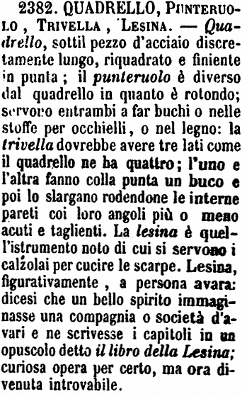 | Quadrello, Punteruolo, Trivella, Lesina - Quadrello, sottil pezzo d'acciaio discretamente lungo, riquadrato e finiente in punta; il punteruolo è diverso dal quadrello in quanto è rotondo; servono entrambi a far buchi o nelle stoffe per occhielli, o nel legno: la trivella dovrebbe avere tre lati come il quadrello ne ha quattro; l'uno e l'altra fanno colla punta un buco e poi lo slargano rodendone le interne pareti coi loro angoli più o meno acuti e taglienti. La lesina è quell'istrumento noto di cui si servono i calzolai per cucire le scarpe. Lesina, figurativamente, a persona avara: dicesi che un bello spirito immaginasse una compagnia o società d'avari e ne scrivesse i capitoli in un opuscolo detto il libro della Lesina; curiosa opera per certo, ma ora divenuta introvabile. [immagine] |