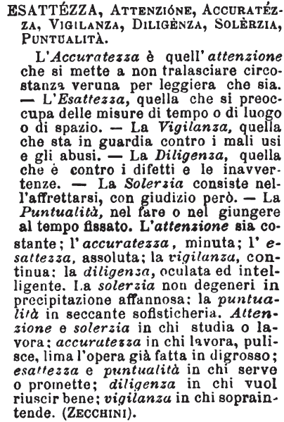 | Esattezza, Attenzione, Accuratezza, Vigilanza, Diligenza, Solerzia, Puntualità - L'Accuratezza è quell'attenzione che si mette a non tralasciare circostanza veruna per leggiera che sia. - L'Esattezza, quella che si preoccupa delle misure di tempo o di luogo o di spazio. - La Vigilanza, quella che sta in guardia contro i mali usi e gli abusi. - La Diligenza, quella che è contro i difetti e le inavvertenze. - La Solerzia consiste nell'affrettarsi, con giudizio però. - La Puntualità, nel fare o nel giungere al tempo fissato. L'attenzione sia costante; l'accuratezza, minuta; l'esattezza, assoluta; la vigilanza, continua: la diligenza, oculata ed intelligente. La solerzia non degeneri in precipitazione affannosa; la puntualità in seccante sofisticheria. Attenzione e solerzia in chi studia o lavora; accuratezza in chi lavora, pulisce, lima l'opera già fatta digrosso; esattezza e puntualità in chi serve o promette; diligenza in chi vuol riuscir bene; vigilanza in chi sopraintende. (Zecchini). [immagine] |