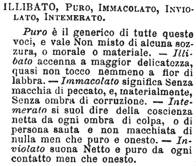 | Illibato, Puro, Immacolato, Inviolato, Intemerato - Puro è il generico di tutte queste voci, e vale Non misto di alcuna sozzura, o morale o materiale. - Illibato accenna a maggior delicatezza, quasi non tocco nemmeno a fior di labbra. - Immacolato significa Senza macchia di peccato, e, materialmente, Senza ombra di corruzione. - Intemerato si suol dire della coscienza netta da ogni ombra di colpa, o di persona santa e non macchiata di nulla men che puro e onesto, - Inviolato suona Netto e puro da ogni contatto men che onesto. [immagine] |