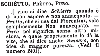 | Schietto, Pretto, Puro - Il vino si dice Schietto quando è di buon sapore e non annacquato. - Pretto, che si usa dai Fiorentini, vale semplicemente Non annacquato. - Puro poi significa senza altra mistura, e quale propriamente lo dà la vite, che si dice anche Sincero, con idea di maggior purezza. (Vedi il numero 2401). [immagine] |