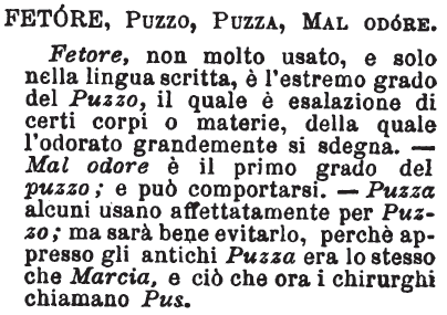 | Fetore, Puzzo, Puzza, Mal odore - Fetore, non molto usato, e solo nella lingua scritta, è l'estremo grado del Puzzo, il quale è esalazione di certi corpi o materie, della quale l'odorato grandemente si sdegna. - Mal odore è il primo grado del puzzo; e può comportarsi. - Puzza alcuni usano affettatamente per Puzzo; ma sarà bene evitarlo, perchè appresso gli antichi Puzza era lo stesso che Marcia, e ciò che ora i chirurghi chiamano Pus. [immagine] |