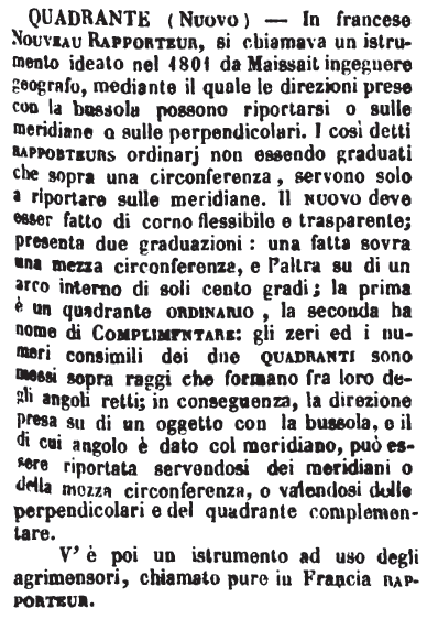 | Quadrante (Nuovo) - In francese Nouveau Rapporteur, si chiamava un istrumento ideato nel 1801 da Maissait ingegnere geografo, mediante il quale le direzioni prese con la bussola possono riportarsi o sulle meridiane o sulle perpendicolari. I così detti rapporteurs ordinarj non essendo graduati che sopra una circonferenza, servono solo a riportare sulle meridiane. Il nuovo deve esser fatto di corno flessibile e trasparente; presenta due graduazioni: una fatta sovra una mezza circonferenza, e l’altra su di un arco interno di soli cento gradi; la prima è un quadrante ordinario, la seconda ha nome di Complimentare: gli zeri ed i numeri consimili dei due quadranti sono messi sopra raggi che formano fra loro degli angoli retti; in conseguenza, la direzione presa su di un oggetto con la bussola, e il di cui angolo è dato col meridiano, può essere riportata servendosi dei meridiani o della mezza circonferenza, o valendosi delle perpendicolari e del quadrante complementare.