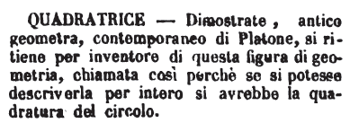 | Quadratrice - Dimostrate, antico geometra, contemporaneo di Platone, si ritiene per inventore di questa figura di geometria, chiamata così perché se si potesse descriverla per intero si avrebbe la quadratura del circolo. [immagine] |