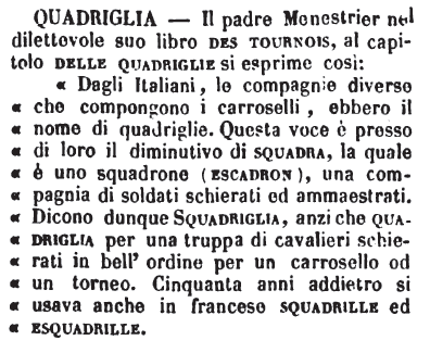 «Dagli Italiani, le compagnie diverse che compongono i carroselli, ebbero il nome di quadriglie. Questa voce è spesso di loro il diminutivo di squadra, la quale è uno squadrone (escadron), una compagnia di soldati schierati ed ammaestrati. Dicono dunque Squadriglia, anzi che quadriglia per una truppa di cavalieri schierati in bell'ordine per un carrosello od un torneo. Cinquanta anni addietro si usava anche in francese squadrille ed esquadrille.» [immagine] |