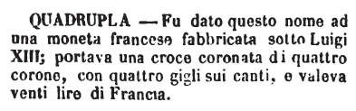 | Quadrupla - Fu dato questo nome ad una moneta francese fabbricata sotto Luigi XIII; portava una croce coronata di quattro corone, con quattro gigli sui canti, e valeva venti lire di Francia. [immagine] |