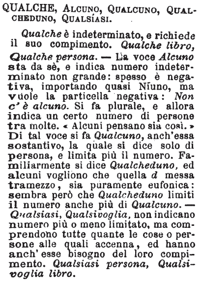 | Qualche, Alcuno, Qualcuno, Qualcheduno, Qualsiasi - Qualche è indeterminato, e richiede il suo compimento. Qualche libro, Qualche persona. - La voce Alcuno sta da sè, e indica numero indeterminato non grande: spesso è negativa, importando quasi Niuno, ma vuole la particella negativa: Non c'è alcuno. Si fa plurale, e allora indica un certo numero di persone tra molte. «Alcuni pensano sia così.» Di tal voce si fa Qualcuno, anch'essa sostantivo, la quale si dice solo di persona, e limita più il numero. Familiarmente si dice Qualcheduno, ed alcuni vogliono che quella d messa tramezzo, sia puramente eufonica: sembra però che Qualcheduno limiti il numero anche più di Qualcuno. - Qualsiasi, Qualsivoglia, non indicano numero più o meno limitato, ma comprendono tutte quante le cose o persone alle quali accenna, ed hanno anch'esse bisogno del loro compimento. Qualsiasi persona, Qualsivoglia libro. [immagine] |
