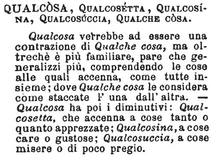 | Qualcosa, Qualcosetta, Qualcosina, Qualcosuccia, Qualche cosa - Qualcosa verrebbe ad essere una contrazione di Qualche cosa, ma oltrechè è più familiare, pare che generalizzi più, comprendendo le cose alle quale accenna, come tutte insieme; dove Qualche cosa le considera come staccate l'una dall'altra. - Qualcosa ha poi i diminutivi: Qualcosetta, che accenna a cose tanto o quanto apprezzate, Qualcosina, a cose care o gustose; Qualcosuccia, a cose misere o di poco pregio. [immagine] |