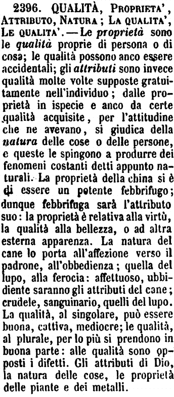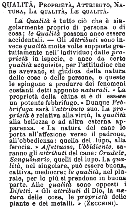 Qualità, Proprietà, Attributo, Natura, La qualità, Le qualità - La Qualità è tutto ciò che è singolarmente proprio di persona o di cosa; le Qualità possono anco essere accidentali. - Gli Attributi sono invece qualità molte volte supposte gratuitamente nell'individuo; dalle proprietà in ispecie, e anco da certe qualità acquisite, per l'attitudine che ne avevano, si giudica della natura delle cose o delle persone, e queste le spingono a produrre dei fenomeni costanti detti appunto naturali. «La proprietà della china si è di essere un potente febbrifugo.» Dunque Febbrifuga sarà l'attributo suo. La proprietà è relativa alla virtù, la qualità alla bellezza o ad altra esterna apparenza. «La natura del cane lo porta all'affezione verso il padrone, all'obbedienza: quella del lupo, alla ferocia.» Affettuoso, Ubbidiente, saranno gli attributi del cane; Crudele, Sanguinario, quelli del lupo. La qualità, nel singolare, può essere buona, cattiva, mediocre; le qualità, nel plurale, per lo più si prendono in buona parte. Alle qualità sono opposti i Difetti. «Gli attributi di Dio, la natura delle cose, le proprietà delle piante e dei metalli.» (Zecchini). [immagine]