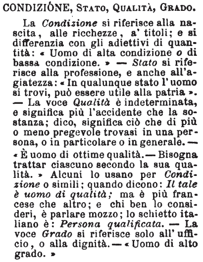Condizione, Stato, Qualità, Grado - La Condizione si riferisce alla nascita, alle ricchezze, a' titoli; e si differenzia con gli adiettivi di quantità: «Uomo di alta condizione o di bassa condizione.» - Stato si riferisce alla professione, e anche all'agiatezza: «In qualunque stato l'uomo si trovi, può essere utile alla patria». - La voce Qualità è indeterminata, e significa più l'accidente che la sostanza; dico, significa ciò che di più o meno pregevole trovasi in una persona, o in particolare o in generale. - «È uomo di ottime qualità. - Bisogna trattar ciascuno secondo la sua qualità.» Alcuni lo usano per Condizione o simili; quando dicono: Il tale è uomo di qualità; ma è più francese che altro; e chi ben lo consideri, è parlare mozzo; lo schietto italiano è: Persona qualificata. - La voce Grado si riferisce solo all'ufficio, o alla dignità. - «Uomo di alto grado.» [immagine]