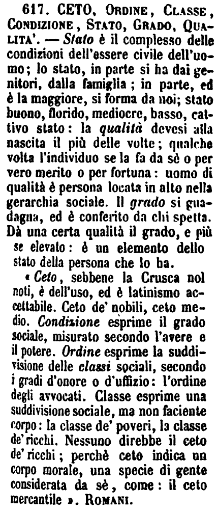 «Ceto, sebbene la Crusca nol noti, è dell'uso, ed è latinismo accettabile. Ceto de' nobili, ceto medio. Condizione esprime il grado sociale, misurato secondo l'avere e il potere. Ordine esprime la suddivisione delle classi sociali, secondo i gradi d'onore o d'uffizio: l'ordine degli avvocati. Classe esprime una suddivisione sociale, ma non faciente corpo: la classe de' poveri, la classe de' ricchi. Nessuno direbbe il ceto de' ricchi; perchè ceto indica un corpo morale, una specie di gente considerata da sè, come: il ceto mercantile». Romani. [immagine]