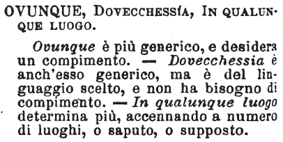 | Ovunque, Dovecchessia, In qualunque luogo - Ovunque è più generico, e desidera un compimento. - Dovecchessia è anch'esso generico, ma è del linguaggio scelto, e non ha bisogno di compimento. - In qualunque luogo determina più, accennando a numero di luoghi, o saputo, o supposto. [immagine] |