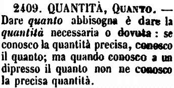 | Quantità, Quanto - Dare quanto abbisogna è dare la quantità necessaria o dovuta: se conosco la quantità precisa, conosco il quanto; ma quando conosco a un dipresso il quanto non ne conosco la precisa quantità. [immagine] |