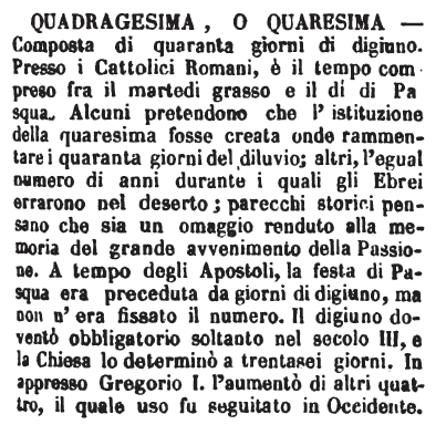 | Quadragesima, Quaresima - Quadragesima e quadragesimale sono vocaboli ecclesiastici e del rituale; ma quaresima e quaresimale sono dell'uso e del parlare comune: tutti sanno che le prediche fatte da un sacro oratore nel corso della quaresima chiamansi, prese nel loro insieme, il suo quaresimale. [immagine] |