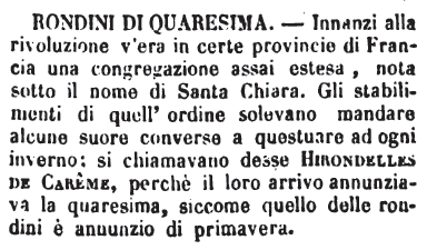 | Rondini di quaresima - Innanzi alla rivoluzione v'era in certe provincie di Francia una congregazione assai estesa, nota sotto il nome di Santa Chiara. Gli stabilimenti di quell'ordine solevano mandare alcune suore converse a questuare ad ogni inverno: si chiamavano desse Hirondelles De Carème, perché il loro arrivo annunziava la quaresima, siccome quello delle rondini è annunzio di primavera. [immagine] |