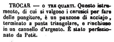 | Trocar - o tre quarti - Questo istrumento, di cui si valgono i cerusici per fare delle pungiture, è un punzone di acciajo, terminato a punta triangolare, e rinchiuso in un cannello d'argento. E' stato perfezionato da Petit. [immagine] |