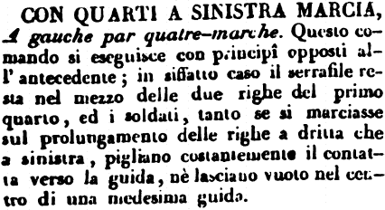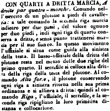 | Con quarti a dritta marcia - A droite par quatre - marche. Comando nell'esercito di un plotone a piedi di cavalleria: a tale comando la seconda riga marcia indietro per due passi, del valore ognuno per due piedi, indi ogni riga di quarto conserva a dritta, e senza punto trattenersi marcia per il suo fianco. In questo movimento l'uffiziale si situa come guida alla sinistra della testa. Il basso-uffiziale della dritta del plotone resta nel mezzo delle due righe del primo quarto. Il serrafile si colloca alla dritta della riga della testa del plotone. Al comando Alto forte, il plotone conservando ogni riga a sinistra ritorna nella sua prima ordinanza e si allinea a dritta: quindi al comando Riga, l'uffiziale, il serrafile, e la seconda riga ripigliano la loro primitiva distanza e collocazione. [immagine] |