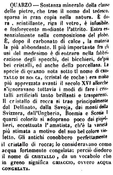 [Cont.] Agr. Geol. Min Metall. 449. v. Le scintille del medesimo oro si veggono quasi attaccate a una certa spezie di sasso bianchissimo, chiamato quarzo da i nostri; e che in Cotteneida si cava. E 466. v. Questa è un'altra spezie di sasso, che a le volte pare che sia trasparente, e 'l chiamano i nostri quarzo; ora è bianchissimo, ora gialletto, ora alquanto celeste. |