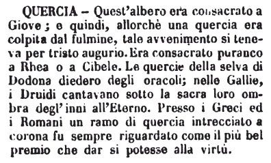 | Quercia - Quest'albero era consacrato a Giove; e quindi, allorchè una quercia era colpita dal fulmine, tale avvenimento si teneva per tristo augurio. Era consacrato puranco a Rhea o a Cibele. Le quercie della selva di Dodona diedero degli oracoli; nelle Gallie, i Druidi cantavano sotto la sacra loro ombra degl'inni all'Eterno. Presso i Greci ed i Romani un ramo di quercia intrecciato a corona fu sempre riguardato come il più bel premio che dar si potesse alla virtù. [immagine] |