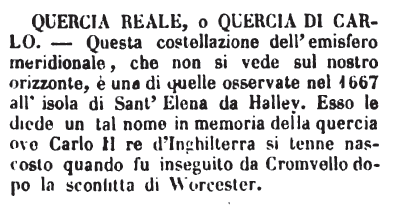 | Quercia reale, o quercia di carlo - Questa costellazione dell'emisfero meridionale, che non si vede sul nostro orizzonte, è una di quelle osservate nel 1667 all'isola di Sant'Elena da Halley. Esso le diede un tal nome in memoria della quercia ove Carlo II re d'Inghilterra si tenne nascosto quando fu inseguito da Cromvello dopo la sconfitta di Worcester. [immagine] |