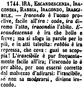 | Ira, Escandescenza, Iracondia, Rabbia, Iracondo, Irascibile - Iracondo è l'uomo proclive, facile all'ira: onde, ira diremo l'atto, iracondia l'abito. Escandescenza è ira che bolle e ferve; ma si sfoga in parole per lo più, e in atti talvolta: rabbia è ira repressa, che cova: guai se scoppia! L'irascibile è pur frequentemente facile all'ira; l'iracondo lo è per abito, per non essersi corretto dal malvezzo d'adirarsi: l'irascibile, se non sa moderarsi, diviene iracondo. [immagine] |