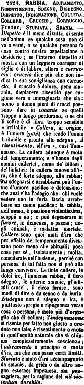 | Rabbia, Adiramento, Risentimento, Sdegno, Disdegno, Dispetto, Indignazione, Collera, Collere, Cruccio, Corruccio, Furore, Sfuriata, Smania - Dispetto è il meno di tutti; si sente nell'animo se qualche cosa non ci va a versi, o se qualche persona fa cosa contro nostra aspettazione o desiderio; se l'interno dispetto si mostra con un leggiero corrugar di ciglio o di labbra, allora è corruccio: cruccio dice più che non indica la sua somiglianza con corruccio; il cruccio è dolore, pena morale, dispiacere risentito per cagione vera o immaginaria che sia: uomo o donna pieni di crucci possono dare in ismanie se quelli troppo a lungo perdurano, o se chi li soffre è di fibra troppo sensibile e irritabile. «Collera, in origine, è l'umore (xολή) che rende l'uomo irritabile e pronto allo sdegno, al risentimento, all'ira», così Tommaseo. La collera adunque è moto del temperamento; e v'hanno degli uomini collerici, come de' biliosi, de' linfatici: la collera muove all'ira, che è forte sdegno, alla rabbia; ma sdegnarsi e arrabbiarsi può l'uomo d'umore pacifico e dolcissimo; che anzi v'ha l'adagio che: chi vuole vedere uno in furia faccia arrabbiare un uomo pacifico: la rabbia, nell'uomo, è passione violentissima, scoppii o no; e può degenerare in furore, in demenza, o pazzia; negli animali, è malattia mortale. Collere sono quei moti d'ira che per effetto del temperamento diventano poco meno che abituali; poca cosa per sè, isolatamente; molta, considerate nell'insieme, perchè con persona di tal fatta non si può alla lunga convivere. Le finte collere, le dolci ire, l'immensa rabbia, il fiero sdegno, le interne smanie, gl'infiniti crucci, il cieco furore, sono modi di dire e da senno e da burla. Disdegno non è sdegno o ira, è piuttosto spregio o ripugnanza verso cosa o persona, è moto più d'orgoglio che di collera; l'indegnazione si risente per fatto non giusto o creduto non tale; è risentimento o moto di quell'equità naturale che si chiama complessivamente coscienza; l'adiramento è principio o moto d'ira, ma che non passa certi limiti. Sfuriata è moto d'ira accompagnato da smanie, da grida o da altro segno esterno; impetuosa, ma passeggiera, per la ragione del nil violentum durabile. [immagine] |