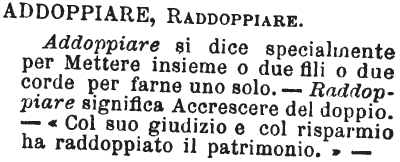 | Addoppiare, Raddoppiare - Addoppiare si dice specialmente per Mettere insieme o due fili o due corde per farne uno solo. Raddoppiare significa Accrescere del doppio. - « Col suo giudizio e col risparmio ha raddoppiato il patrimonio. » - [immagine] |