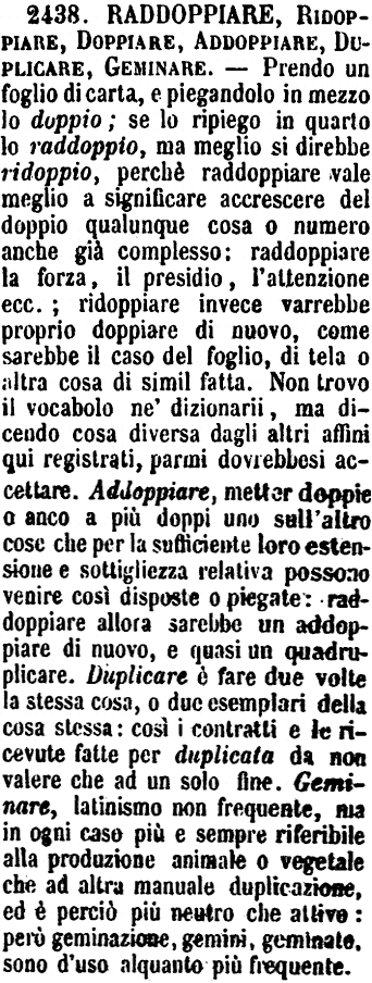 | Raddoppiare, Ridoppiare, Doppiare, Addoppiare, Duplicare, Geminare - Prendo un foglio di carta, e piegandolo in mezzo lo doppio; se lo ripiego in quarto lo raddoppio, ma meglio si direbbe ridoppio, perchè raddoppiare vale meglio a significare accrescere del doppio qualunque cosa o numero anche già complesso: raddoppiare la forza, il presidio, l'attenzione ecc.; ridoppiare invece varrebbe proprio doppiare di nuovo, come sarebbe il caso del foglio, di tela o altra cosa di simil fatta. Non trovo il vocabolo ne' dizionarii, ma dicendo cosa diversa dagli altri affini qui registrati, parmi dovrebbesi accettare. Addoppiare, metter doppie o anco a più doppi uno sull'altro cose che per la sufficiente loro estensione e sottigliezza relativa possono venire così disposte o piegate: raddoppiare allora sarebbe un addoppiare di nuovo, e quasi un quadruplicare. Duplicare è fare due volte la stessa cosa, o due esemplari della cosa stessa: così i contratti e le ricevute fatte per duplicata da non valere che ad un solo fine. Geminare, latinismo non frequente, ma in ogni caso più e sempre riferibile alla produzione animale o vegetale che ad altra manuale duplicazione, ed è perciò più neutro che attivo: però geminazione, gemini, geminate, sono d'uso alquanto più frequente. [immagine] |
