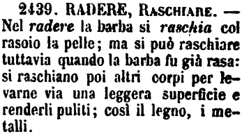 | Radere, Raschiare - Nel radere la barba si raschia col rasoio la pelle; ma si può raschiare tuttavia quando la barba fu già rasa: si raschiano poi altri corpi per levarne via una leggera superficie e renderli puliti; così il legno, i metalli. [immagine] |