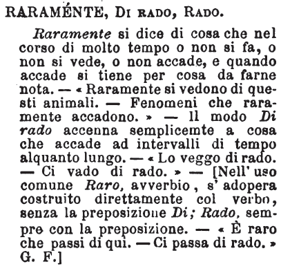 | Raramente, Di rado, Rado - Raramente si dice di cosa che nel corso di molto tempo o non si fa, o non si vede, o non accade, e quando accade si tiene per cosa da farne nota. - «Raramente si vedono di questi animali. - Fenomeni che raramente accadono.» - Il modo Di rado accenna semplicemente a cosa che accade ad intervalli di tempo alquanto lungo. - «Lo veggo di rado. – Ci vado di rado.» - [Nell’uso comune Raro avverbio, s’adopera costruito direttamente col verbo, senza la preposizione Di; Rado, sempre con la preposizione. - «E’ raro che passi di qui. – Ci passa di rado.» G. F.] [immagine] |