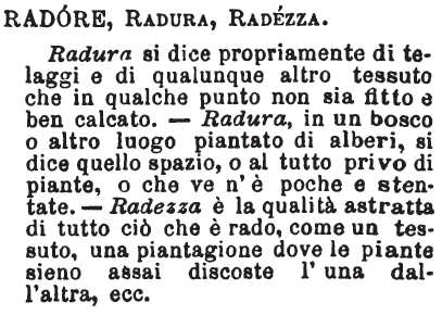 | Radore, Radura, Radezza - Radura si dice propriamente di telaggi e di qualunque altro tessuto che in qualche punto non sia fitto e ben calcato. - Radura, in un bosco o altro luogo piantato di alberi, si dice quello spazio, o al tutto privo di piante, o che ve n'è poche e stentate. - Radezza è la qualità astratta di tutto ciò che è rado, come un tessuto, una piantagione dove le piante sieno assai discoste l'una dall'altra, ecc. [immagine] |