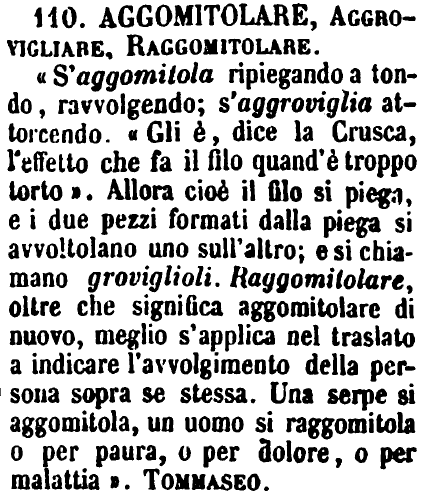 | Usando "raggomitolare" (*) si possono ottenere i seguenti risultati: * erta = raggomitolata; * erte = raggomitolate; * erti = raggomitolati; * erto = raggomitolato. |