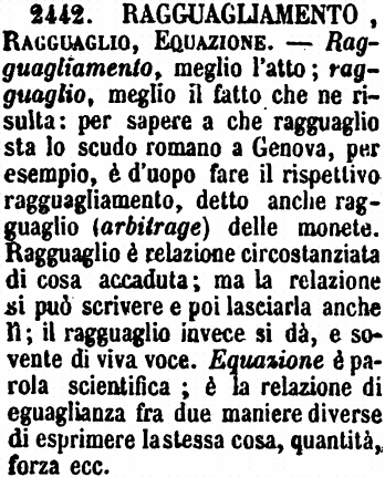 | Ragguagliamento, Ragguaglio, Equazione - Ragguagliamento, meglio l'atto; ragguaglio, meglio il fatto che ne risulta: per sapere a che ragguaglio sta lo scudo romano a Genova, per esempio, è d'uopo fare il rispettivo ragguagliamento, detto anche ragguaglio (arbitrage) delle monete. Ragguaglio è relazione circostanziata di cosa accaduta; ma la relazione si può scrivere e poi lasciarla anche lì; il ragguaglio invece si dà, e sovente di viva voce. Equazione è parola scientifica; è la relazione di eguaglianza fra due maniere diverse di esprimere la stessa cosa, quantità, forza ecc. [immagine] |