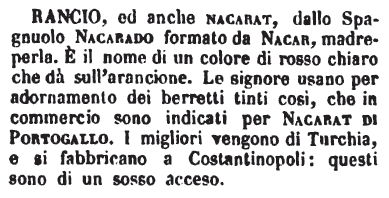| Rancio - ed anche nacarat, dallo Spagnuolo Nacarado formato da Nacar, madreperla. E' il nome di un colore di rosso chiaro che dà sull'arancione. Le signore usano per adornamento dei berretti tinti così, che in commercio sono indicati per Nacarat di Portogallo. I migliori vengono di Turchia, e si fabbricano a Costantinopoli: questi sono di un rosso acceso. [immagine] |