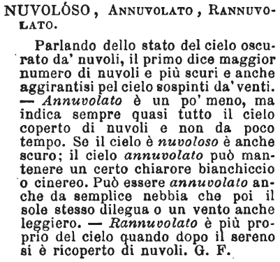 | Nuvoloso, Annuvolato, Rannuvolato - Parlando dello stato del cielo oscurato da' nuvoli, il primo dice maggior numero di nuvoli e più scuri e anche aggirantisi pel cielo sospinti da' venti. - Annuvolato è un po' meno, ma indica sempre quasi tutto il cielo coperto di nuvoli e non da poco tempo. Se il cielo è nuvoloso è anche scuro; il cielo annuvolato può mantenere un certo chiarore bianchiccio o cinereo. Può esser annuvolato anche da semplice nebbia che poi il sole stesso dilegua o un vento anche leggiero. - Rannuvolato è piu proprio del cielo quando dopo il sereno si è ricoperto di nuvoli. G. F. [immagine] |