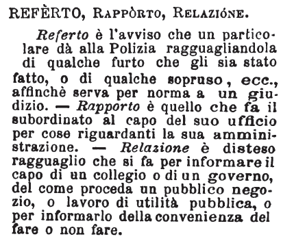 | Referto, Rapporto, Relazione - Referto è l'avviso che un particolare dà alla Polizia ragguagliandola di qualche furto che gli sia stato fatto, o di qualche sopruso, ecc., affinchè serva per norma a un giudizio. - Rapporto è quello che fa il subordinato al capo del suo ufficio per cose riguardanti la sua amministrazione. - Relazione è disteso ragguaglio che si fa per informare il capo di un collegio o di un governo, del come proceda un pubblico negozio, o lavoro di utilità pubblica, o per informarlo della convenienza del fare o non fare. [immagine] |