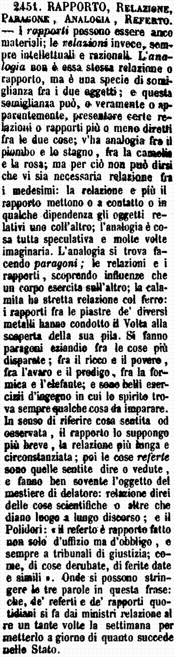 | Rapporto, Relazione, Paragone, Analogia, Referto - I rapporti possono essere anco materiali; le relazioni invece, sempre intellettuali e razionali. L'analogia non è essa stessa relazione o rapporto, ma è una specie di somiglianza fra i due oggetti; e questa somiglianza può, o veramente o apparentemente, presentare certe relazioni o rapporti più o meno diretti fra le due cose; v'ha analogia fra il piombo e lo stagno, fra la camelia e la rosa; ma per ciò non può dirsi che vi sia necessaria relazione fra i medesimi: la relazione e più il rapporto mettono o a contatto o in qualche dipendenza gli oggetti relativi uno coll'altro; l'analogia è cosa tutta speculativa e molte volte imaginaria. L'analogia si trova facendo paragoni; le relazioni e i rapporti, scoprendo influenze che un corpo esercita sull'altro; la calamita ha stretta relazione col ferro: i rapporti fra le piastre de' diversi metalli hanno condotto il Volta alla scoperta della sua pila. Si fanno paragoni eziandio fra le cose più disparate; fra il ricco e il povero, fra l'avaro e il prodigo, fra la formica e l'elefante; e sono belli esercizii d'ingegno in cui lo spirito trova sempre qualche cosa da imparare. In senso di riferire cosa sentita od osservata, il rapporto lo suppongo più breve, la relazione più lunga e circonstanziata; poi le cose referte sono quelle sentite dire o vedute, e fanno ben sovente l'oggetto del mestiere di delatore: relazione direi delle cose scientifiche o altre che diano luogo a lungo discorso; e il Polidori: « il referto è rapporto fatto non solo d'uffizio ma d'obbligo, e sempre a tribunali di giustizia; come, di cose derubate, di ferite date e simili ». Onde si possono stringere le tre parole in questa frase: che, de' referti e de' rapporti quotidiani si fa dai ministri relazione al re un tante volte la settimana per metterlo a giorno di quanto succede nello Stato. [immagine] |