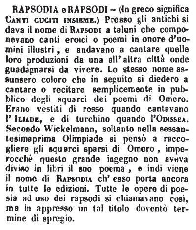 | Rapsodia e Rapsodi - (In greco significa Canti cuciti insieme.) Presso gli antichi si dava il nome di Rapsodi a taluni che componevano canti eroici o poemi in onore d'uomini illustri, e andavano a cantare quelle loro produzioni da una all'altra città onde guadagnarsi da vivere. Lo stesso nome assunsero coloro che in seguito si diedero a cantare o recitare semplicemente in pubblico degli squarci dei poemi di Omero. Erano vestiti di rosso quando cantavano l'Iliade, e di turchino quando l'Odissea. Secondo Wickelmann, soltanto nella sessantesimaprima Olimpiade si pensò a raccogliere gli squarci sparsi di Omero, imperocchè questo grande ingegno non aveva diviso in libri il suo poema, e indi viene il nome di Rapsodia ch'esso porta ancora in tutte le edizioni. Tutte le opere di poesia ad uso dei rapsodi si chiamavano così, ma in appresso un tal titolo doventò termine di spregio. [immagine] |