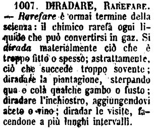 | Diradare, Rarefare - Rarefare è ormai termine della scienza: il chimico rarefà ogni liquido che può convertirsi in gaz. Si dirada materialmente ciò che è troppo fitto o spesso; astrattamente, ciò che succede troppo sovente; diradare la piantagione, sterpando qua e colà qualche gambo o fusto; diradare l'inchiostro, aggiungendovi aceto o vino; diradar le visite, facendone a più lunghi intervalli. [immagine] |
