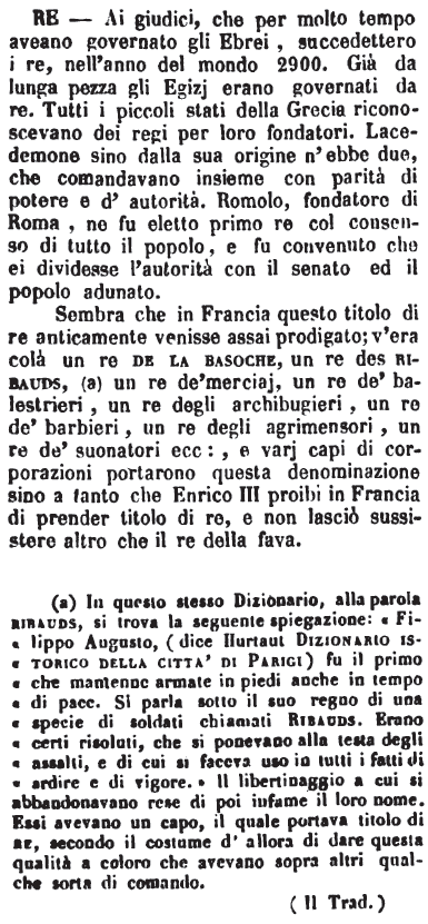 Sembra che in Francia questo titolo di re anticamente venisse assai prodigato; v'era colà un re de la basoche, un re des ribauds, (a) un re de' merciaj, un re de' balestrieri, un re degli archibugieri, un re de' barbieri, un re degli agrimensori, un re de' suonatori ecc:, e varj capi di corporazioni portarono questa denominazione sino a tanto che Enrico III proibì in Francia di prender titolo di re, e non lasciò sussistere altro che il re della fava. (a) In questo stesso Dizionario, alla parola ribauds, si trova la seguente spiegazione: «Filippo Augusto, (dice Hurtaut Dizionario istorico della città di Parigi) fu il primo che mantenne armate in piedi anche in tempo di pace. Si parla sotto il suo regno di una specie di soldati chiamati Ribauds. Erano certi risoluti, che si ponevano alla testa degli assalti, e di cui si faceva uso in tutti i fatti di ardire e di vigore.» Il libertinaggio a cui si abbandonavano rese di poi infame il loro nome. Essi avevano un capo, il quale portava titolo di re, secondo il costume d'allora di dare questa qualità a coloro che avevano sopra altri qualche sorta di comando. (II Trad.) [immagine] |
