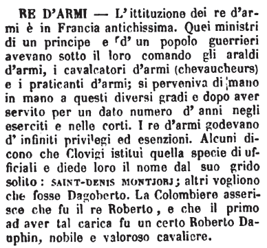 | Re d’armi - L'ittituzione dei re d'armi è in Francia antichissima. Quei ministri di un principe e d'un popolo guerrieri avevano sotto il loro comando gli araldi d'armi, i cavalcatori d'armi (chevaucheurs) e i praticanti d'armi; si perveniva di mano in mano a questi diversi gradi e dopo aver servito per un dato numero d'anni negli eserciti e nelle corti. I re d'armi godevano d'infiniti privilegi ed esezioni. Alcuni dicono che Clovigi istituì quella specie di ufficiali e diede loro il nome dal suo grido solito: saint-denis montjorj; altri vogliono che fosse Dagoberto. La Colombiere asserisce che fu il re Roberto, e che il primo ad aver tal carica fu un certo Roberto Dauphin, nobile e valoroso cavaliere. [immagine] |