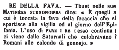 | Re della fava - Thuet nelle sue Matinées suenonoises dice: « E' quegli a cui è toccata la fava della focaccia che si spartisce alla vigilia od al giorno dell'Epifania. L'uso di fare i re (esso continua) ci viene dalle Saturnali che celebravano i Romani alle calende di gennajo. » [immagine] |