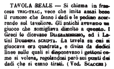 | Tavola reale - Si chiama in francese tric-trac, voce che imita assai bene il rumore che fanno i dadi e le pedine scorrendo sul tavoliere. Gli antichi avevano un giuoco che somigliava dimolto a questo. I Greci lo dicevano Diagrammismo, ed i Latini Duodena scripta. La tavola su cui si giuocava era quadrata, e divisa da dodici linee sulle quali si disponevano i gettoni come si voleva, regolandosi però sui punti dei dadi che si erano tirati. (Ved. Scacchi) [immagine] |