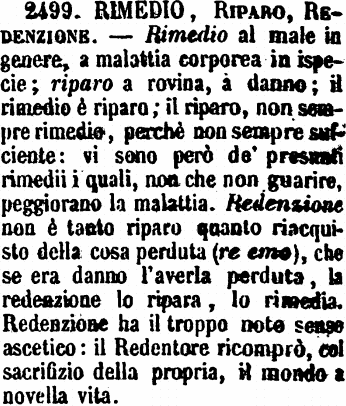 | Rimedio, Riparo, Redenzione - Rimedio al male in genere, a malattia corporea in ispecie; riparo a rovina, a danno; il rimedio è riparo; il riparo, non sempre rimedio, perchè non sempre sufficiente: vi sono però de' presunti rimedii i quali, non che non guarire, peggiorano la malattia. Redenzione non è tanto riparo quanto riacquisto della cosa perduta (re emo), che se era danno l'averla perduta, la redenzione lo ripara, lo rimedia. Redenzione ha il troppo noto senso ascetico: il Redentore ricomprò, col sacrifizio della propria, il mondo a novella vita. [immagine] |