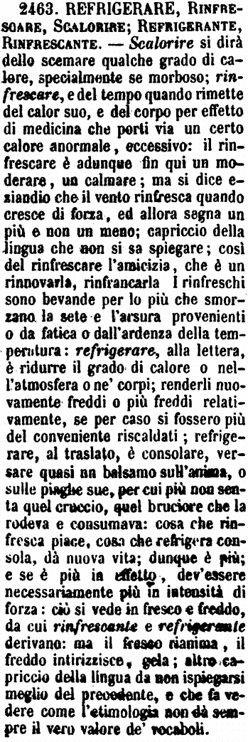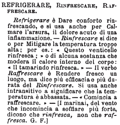 | Refrigerare, Rinfrescare, Raffrescare - Refrigerare è Dare conforto rinfrescando, e si usa anche per Calmare l'arsura, il dolore acuto di una infiammazione. - Rinfrescare si dice o per Mitigare la temperatura troppo alta; per es.: «Questo venticello rinfresca;» o di alcuna sostanza che modera il calore interno del corpo: «Il tamarindo rinfresca.» - Il verbo Raffrescare è Rendere fresco un luogo, ma dice più efficacia e più durata del Rinfrescare. Si usa anche intransitivo a significare che la temperatura è abbassata. - «Comincia a raffrescare.» - [I marinai, del vento che incomincia a soffiare più forte, dicono che rinfresca, non che raffresca. G. F.] [immagine] |
